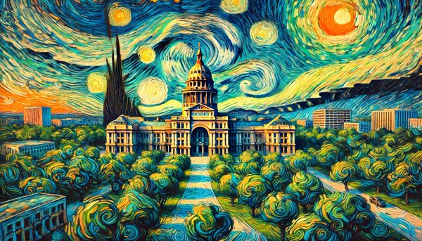 Vibrant swirls of blue and yellow dance across the canvas as the Texas State Capitol stands majestically at the heart of this Van Gogh-inspired artistic interpretation. Renowned for its classical beauty, the Capitol here is reimagined under a tumultuous, Van Gogh-style sky, its intricate details highlighted by vivid colors and dynamic brush strokes. The foreground is lush with stylized, wave-like trees, lending an ethereal quality to the familiar landscape of Austin, Texas. This striking artwork offers the viewer both a sense of motion and tranquility, invoking a deep appreciation for the fusion of natural and architectural beauty. The warm sunset on the horizon contrasts with the cool tones of the sky, drawing the eye to explore every part of the scene's rich texture and depth. *** About Texas State Capitol: Situated in Austin, the Texas State Capitol is an iconic edifice of significant historical and architectural value. Designed in 1881 and completed in 1888, this landmark stands as a testament to the state's formidable history and culture. Made predominantly from red granite, the Capitol impresses with its Renaissance Revival style. It serves as the home of the Texas legislature and the office of the governor, playing a vital role in the political life of the region. The building is not only a crucial hub for legislative proceedings but also a popular tourist destination, celebrated for its elaborate and grandiose design.