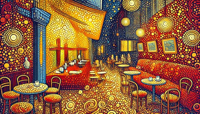 Stepping into "The Night Café" as reimagined by Vincent van Gogh is like walking into a whirl of emotions and colors. This masterful artwork captures the ambience of a café in Saint-Rémy-de-Provence, enveloping the viewer in hues of deep reds and amber yellows under swirling starry patterns. Van Gogh's distinctive brushwork and use of contrasting colors imbue the scene with a sense of vibrancy and turmoil, reflecting his internal emotional landscape. The circular forms create a dynamic, dizzying effect, emphasizing the artist's fascination with movement and light. Each table and chair, although empty, seems to whisper stories of nocturnal gatherings, adding layers of depth and narrative to the visually striking composition. Disclaimer: This is a digital reproduction inspired by the original artwork. It is not an official scan or photograph of the original painting.