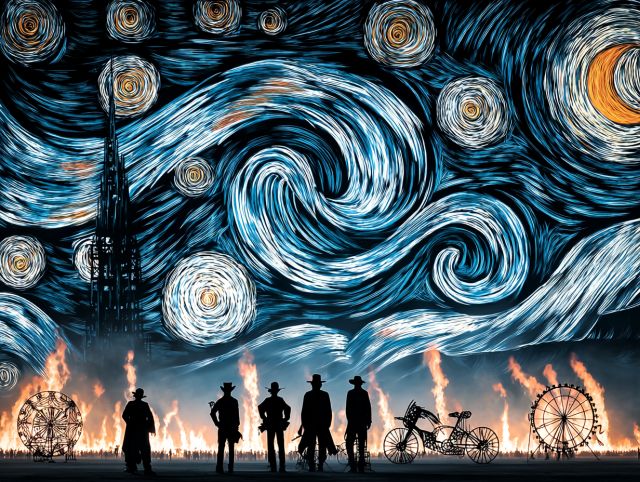 Amidst the swirling cosmos of Van Gogh's iconic 'Starry Night', the vibrant scene has been transformed into an extraordinary festival setting reminiscent of Burning Man. Intricate flames lick the air as silhouetted figures stand in awe, gazing into the powerful whirls of deep blues and vivid yellows. The oil on canvas technique brings alive the animated brush strokes, capturing the essence and dynamic energy of the night sky, now ignited by contemporary man-made fires. This unique interpretation not only celebrates Van Gogh’s unparalleled style but also bridges historical art with modern cultural phenomena, blending two worlds into a seamless, imaginative spectacle. Disclaimer: This is a digital reproduction inspired by the original artwork. It is not an official scan or photograph of the original painting.