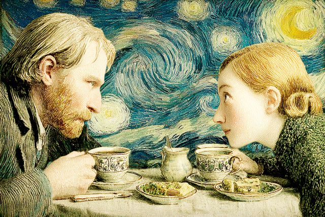 Under the swirls of a Starry Night, two figures share a quiet, introspective moment in "An Imaginary Evening with Van Gogh at The Night Café." This artistic fusion depicts Vincent van Gogh and a companion deeply engrossed in conversation, their forms illuminated by the gentle luminescence of café candlelight. Every brushstroke captures the essence of emotion, from Van Gogh's thoughtful gaze to the earnest attentiveness of his companion. The background's turbulent blues and yellows echo Van Gogh's famous "Starry Night," enveloping the couple in a cocoon of moving colors that symbolize the tumultuous inner world of the artist. The setting, inspired by "The Night Café," another of his masterworks, features intimate details that suggest warmth and closeness. This scene, though conjured from the imagination, resonates with the emotional depth and stylistic characteristics typical of Van Gogh's post-impressionist period, focusing on personal experiences and emotional representations rather than pictorial reality. *** About An Imaginary Evening with Van Gogh at The Night Café ***: Although this particular scene is an artistic creation and not a historical documentation, it draws heavily on elements from Vincent van Gogh's real artworks and his emotional landscape. Van Gogh, a post-impressionist master who was known for his vivid colors and emotional depth, often used his work to express his feelings and struggles. The swirling, expressive sky of "Starry Night" and the oppressive mood of "The Night Café" come together in this composite to explore a hypothetical personal interaction. Elements like the textured brushwork and bold, emotive color choices are characteristic of Van Gogh's style. While the piece itself isn't part of Van Gogh's actual oeuvre, it invites viewers to ponder the artist's interactions and emotional state during his productive yet tumultuous years. Locations of the original inspirations are well-documented; "Starry Night" resides in the Museum of Modern Art in New York, and "The Night Café" is at the Yale University Art Gallery. Disclaimer: This is a digital reproduction inspired by the original artwork. It is not an official scan or photograph of the original painting.