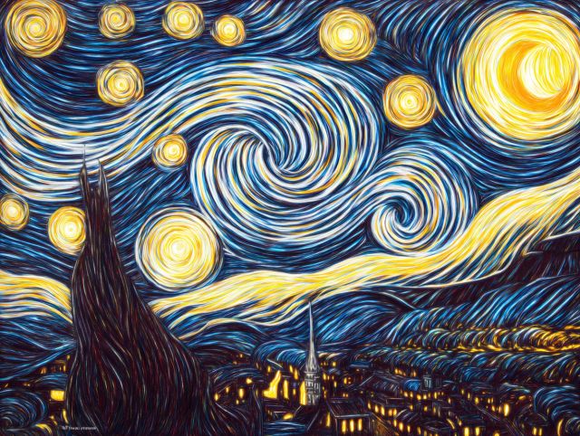 Bathed in a swirl of cobalt blues and glowing yellows, Vincent van Gogh's "Starry Night" enraptures the viewer with its turbulent emotion and dramatic, swirling vista. Painted in June 1889, this masterpiece transports its audience into a dreamlike state where the boundary between sky and landscape blurs, and the stars whirl in frenzied motion. The night sky, alive with bursts of yellow and white against a deep blue, appears almost to pulsate with energy and emotion. Below this cosmic display, the quaint village of Saint-Rémy lies peaceful and still, grounded under the tumultuous skies yet isolated from the cosmic dance above. This vivid contrast between the heavens and the earth invites a contemplative mood, making viewers ponder the inner turmoil Van Gogh experienced during his time at the Saint-Paul asylum. "Starry Night" is more than a depiction of a scenic nighttime; it's an insight into the artist's mind, resplendent with chaos and beauty, playing endlessly across the canvas. Disclaimer: This is a digital reproduction inspired by the original artwork. It is not an official scan or photograph of the original painting.