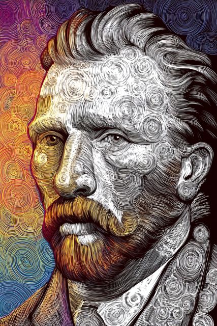 Stepping into the swirls of the ethereal realm, this unique rendition of Vincent van Gogh's self-portrait transports the viewer into a mesmerizing spectacle of color and motion. Unlike the traditional strokes commonly associated with van Gogh, this artwork exploits a psychedelic palette that spans from deep purples to radiant yellows, intertwining them with the fluidity and rhythm of celestial orbits. Van Gogh's visage is captured with graphic lines that echo the emotional intensity and turbulence that marked his personal and artistic life. The swirling patterns in the background suggest not just movement, but a profound connectivity to the universe at large—a symbol of the artist's quest for solace and understanding through his art. *** About the Artwork: This artwork, though inspired by Van Gogh's series of self-portraits, diverges significantly in style and technique from the post-impressionist works created by the artist during the late 1880s. Unlike his typical brushwork, this image uses graphic lines and vibrant, non-traditional colors, suggesting a modern reinterpretation of his style. Van Gogh painted over thirty self-portraits between 1886 and 1889. These works were not only depictions of his facial features but also conveyances of his emotional and psychological state. They are reflective of his ongoing quest for identity and self-understanding. The original self-portraits are scattered across various prestigious museums globally, predominantly in Europe and the United States. This specific reinterpretation, though not a direct creation of Van Gogh, serves as a bridge between classical artistry and contemporary digital art, showcasing how his timeless influence extends beyond traditional media. Disclaimer: This is a digital reproduction inspired by the original artwork. It is not an official scan or photograph of the original painting.