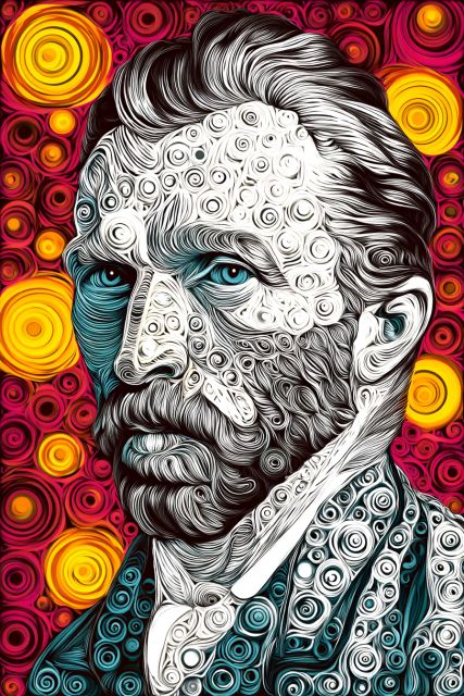 Bathed in a vibrant spectrum of swirling colors, this reimagination of a self-portrait by Vincent van Gogh captivates the viewer with an emotional depth that feels both dreamlike and intense. The artist's face is depicted with bold, expressive lines and textures, which seem to undulate with life and energy, reminiscent of Van Gogh's original dynamic brushstrokes. Each whirl and curl is ingeniously transformed into starry shapes, creating a visual symphony that echoes Van Gogh's fascination with the celestial. This piece uniquely blends the historical with the modern, striking a harmony between traditional portraiture and contemporary graphic stylings, inviting the viewer into a mesmerizing, star-filled gaze of one of the most revered artists in history. ***About the Dreamy Star-shape-laden Van Gogh Self-Portrait in Vibrant Colors***: Vincent van Gogh, the post-impressionistic master whose work has captivated and influenced many, is known for his vivid self-portraits which encapsulate both his psychological depth and artistic brilliance. This piece, though a modern reinterpretation, carries the essence of Van Gogh's numerous self-portraits from the late 1880s. Employing a myriad of star shapes, the artist reimagines Van Gogh's consistent theme of introspection and emotional turbulence. The original self-portraits were often tools through which Van Gogh conveyed his ongoing struggle with mental illness and his quest for understanding through the medium of oil on canvas. The style reflects Van Gogh's signature swirls, a visual style he often associated with his most famous work, "The Starry Night." This interpretation might not correspond to an original work of Van Gogh but follows the emotional and stylistic narratives that characterize his portraits. As a modern digital artifact, it is not housed in a traditional sense but circulates widely online, celebrating Van Gogh's lasting impact on both traditional and digital art forms. Disclaimer: This is a digital reproduction inspired by the original artwork. It is not an official scan or photograph of the original painting.