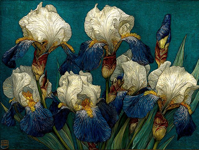 The canvas comes alive with the intoxicating beauty of irises, as seen through the eyes of Vincent Van Gogh. This masterpiece, titled "Irises Blooming Through the Bedroom Window," vibrates with a palpitating array of colors, each stroke bearing the intense emotional energy for which Van Gogh is renowned. The artwork captures a cluster of irises; the whites and vibrant blues are complemented by touches of yellow, setting a dramatic contrast against the dark lush greens of their stalks. The painting’s background, rendered in a swirling teal pattern, enhances the organic, almost wild nature of the subject. Van Gogh's technique of bold, expressive lines and the textured application of paint, help depict not just the visual awe of the scene but also its tactile essence. As viewers, we are not merely observers, but almost feel the softness of the iris petals and the cool morning air suggesting the presence of a gentle breeze. *** About the Irises Blooming Through the Bedroom Window: This painting was created during Van Gogh’s stay at the Saint-Paul-de-Mausole asylum in Saint-Rémy-de-Provence, in the last year before his death in 1890. During this period, Van Gogh's work became characterized by swirling brushstrokes and a vivid color palette, features strongly evident in this piece. The inspiration for this work likely came from the gardens of the asylum, where Van Gogh would have seen irises blooming. This natural theme provided a therapeutic and calming focus for him during a time of great personal turmoil. The artwork is currently thought to be held in a private collection, rarely seen by the public. Disclaimer: This is a digital reproduction inspired by the original artwork. It is not an official scan or photograph of the original painting.