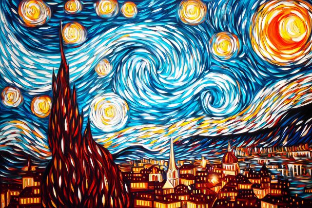 Enveloped in a shimmering cloak of midnight, "Starry Night Over the Rhone" captures Vincent van Gogh’s profound love affair with the night sky. Painted in 1888, just two years before his untimely death, this majestic oil on canvas glimmers with the tranquil yet solemn peace of the nocturnal landscape. Van Gogh’s mastery in manipulating light to evoke emotion shines poignantly in this celestial scene. Vibrant stars twinkle against the vast, swirling blue expanse, reflecting dynamically in the gently flowing Rhone River, uniting sky and water in a luminous dance. This serene nocturne subtly captures the bustling intimacy of life beneath the expansiveness of the cosmos, revealing Van Gogh’s fascination with the infinite. *** About Starry Night Over the Rhone: Van Gogh painted this compelling scene during his stay in Arles, France, in September 1888. Influenced by the innovative techniques of Impressionism and the color theories of Neo-Impressionism, Van Gogh’s style evolved to include swirling, dynamic brushstrokes that are vividly pronounced in this artwork. "Starry Night Over the Rhone" is more than a picturesque landscape; it is an intimate portrayal of the harmony existing between humanity and the vastness of the universe, serving as a contemplative reflection on our place within it. The inspiration for this piece arose from the starlit nights that enchanted Van Gogh during his walks along the banks of the Rhone River. Presently, this masterpiece resides in the Musée d'Orsay in Paris, standing as a testament to Van Gogh’s enduring legacy and his relentless pursuit of capturing the emotional essence of nightscapes. Disclaimer: This is a digital reproduction inspired by the original artwork. It is not an official scan or photograph of the original painting.