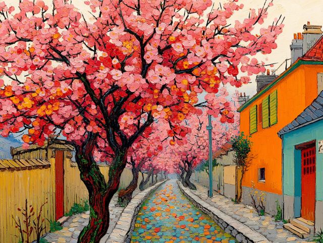 Immerse yourself in the vibrant hues and tranquil beauty of Van Gogh's "Peach Trees in Blossom Along a Cobblestone Lane." Created during the profound springtime of his life, this canvas sings with the symphony of pink blossoms, set against a quaint village backdrop. Each brushstroke captures the essence of renewal and hope, an emblematic Van Gogh theme explored through a radiant palette and dynamic textures. The blossomed peach trees curve gracefully over a serene street, turning the everyday path into a celebration of nature's fleeting wonders. The juxtaposition of vivid flora against the structured, colorful village homes invites viewers into a harmonious coexistence of man and nature, suggesting a moment of peace in the artist’s often turbulent life. *** About Peach Trees in Blossom Along a Cobblestone Lane: Vincent Van Gogh painted this striking scene in 1888, during his prolific period in Arles, a time marked by an intense output of artworks featuring landscapes, still lifes, and rural life. This piece is rich in the Post-Impressionist style for which Van Gogh is renowned, characterized by expressive, emotive coloration and energetic application of paint. This painting reflects Van Gogh's newfound interest in capturing the fleeting qualities of light and color through subjects that others might consider ordinary. The artwork stands as a testament to Van Gogh’s belief in finding beauty in the simplest of settings. It is likely that the vibrant, life-affirming presence of the peach blossoms against everyday life spoke to Van Gogh’s search for serenity amidst personal struggles. Currently, the painting is housed in the Van Gogh Museum in Amsterdam, drawing thousands of visitors who seek a glimpse into the artist’s vision of spring’s awakening. Disclaimer: This is a digital reproduction inspired by the original artwork. It is not an official scan or photograph of the original painting.