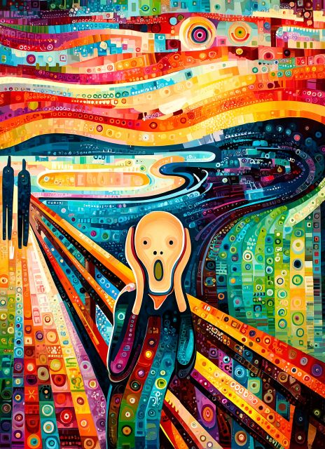 Immerse yourself in a vibrant explosion of colors in this digital reimagining of Edvard Munch’s iconic masterpiece "The Scream". Swirling hues of reds, blues, and yellows cast a psychedelic twist on the original expressionist depiction of existential angst. Each curved line and circular pattern breathes a new life into the timeless figure amidst an abstract backdrop that mirrors the chaotic emotions portrayed by the agonized subject. This modern interpretation is not just a visual spectacle but a bridge connecting classic artistry with contemporary digital techniques, offering viewers a fresh lens through which to experience the profound emotional depth of the original. *** About the Reimagined Digital Depiction of Edvard Munch's "The Scream": Disclaimer: This is a digital reproduction inspired by the original artwork. It is not an official scan or photograph of the original painting.