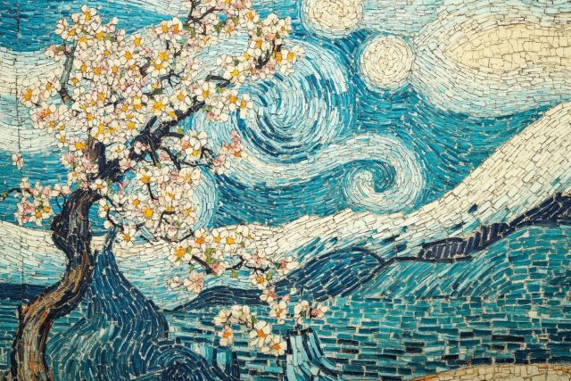 Lose yourself in the swirling vortex of iridescent blues and crisp whites as traditional Japanese Ukiyo-e merges with Van Gogh's iconic Starry Night. This remarkable fusion breathes new life into the familiar swirls, now adorned with ethereal blossoms typical of Japanese art. The texture is palpable; each stroke of Van Gogh’s signature impastoesque technique coupled with the delicate line work of Ukiyo-e, creates a tangible scene that viewers can almost feel under their fingertips. The sublime tranquility of the night sky contrasts vividly with the vibrant life of the blooming cherry trees—a symbolic reminder of life’s fleeting beauty amidst the eternal cosmos. Disclaimer: This is a digital reproduction inspired by the original artwork. It is not an official scan or photograph of the original painting.