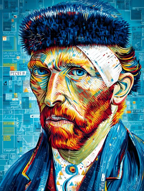 Immerse yourself in a striking reimagining of Vincent van Gogh's “Self-Portrait with Bandaged Ear,†an evocative piece infused with modern design elements courtesy of Ross Lovegrove and Stefan Sagmeister. This rendition transforms the original poignant atmosphere into a vibrant, technology-infused tableau, reminiscent of a dynamic, interconnected blueprint. Here, the haunting gaze of van Gogh, characterized by his piercing eyes and the iconic bandage over his ear, is overlaid with a complex web of engineering schematics and vivid color strokes, which add a layer of contemporary resonance and beg the viewer to delve deeper into the psyche of this tortured artist. The synthesis of van Gogh’s raw emotion and modern graphic design invites a fresh dialogue on the intersection of art, emotion, and innovation. *** About the Self-Portrait with Bandaged Ear Reimagined: Disclaimer: This is a digital reproduction inspired by the original artwork. It is not an official scan or photograph of the original painting.