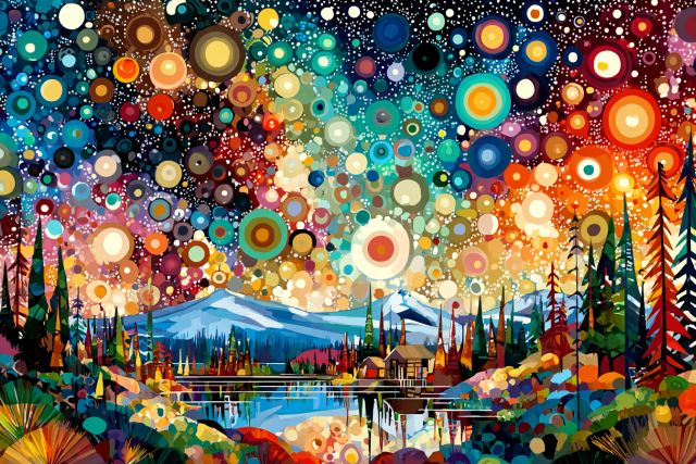 Plunge into a cosmic voyage with this imaginative interpretation of Van Gogh's "Starry Night," where the vibrant universe melds with serene earthly landscapes. It’s an artwork that transports the observer beyond a mere visual experience to an emotional odyssey across the cosmos. The heavenly bodies burst in a kaleidoscope of hues, gracefully transitioning into a tranquil earthly scene framed with lush, vivid forestry and a quiet lake reflecting the celestial dance overhead. The cabin, poised on the water's edge, invites one to imagine a retreat from the bustling world into the quietude of nature under the watchful gaze of the universe. The artwork is a masterful blend of color, motion, and emotion, evoking a sense of wonder and deep contemplation about our place within the cosmos. *** About Starry Night Interpreted as a Cosmic Landscape with Earthly Vista: Though conceptualized from the key elements of Van Gogh’s renowned "Starry Night," created in June 1889 during his stay at the Saint-Paul-de-Mausole asylum in Saint-Rémy-de-Provence, France, this interpretation serves as a bridge between the classical and the innovative. The original painting’s style is post-impressionistic, well-noted for its bold, dramatic brush strokes which swirl across the canvas, conveying emotion and motion in a style that defies the realistic representations of the time. The vivid blues and yellows of the original night sky have been transformed to include a broader palette, symbolizing a vast, energetic universe. The inspiration behind this artwork stretches beyond Van Gogh’s own struggles and transcends into a universal contemplation of beauty and tranquility amidst the chaotic cosmos. Though Van Gogh never saw his work celebrated as it is today, pieces like this invite viewers to explore and find personal solace in the immensity of the universe, intertwining their soul with spitit and nature. The location of this specific interpretation isn’t documented, as it deviates into creative realms beyond Van Gogh’s original works. Disclaimer: This is a digital reproduction inspired by the original artwork. It is not an official scan or photograph of the original painting.