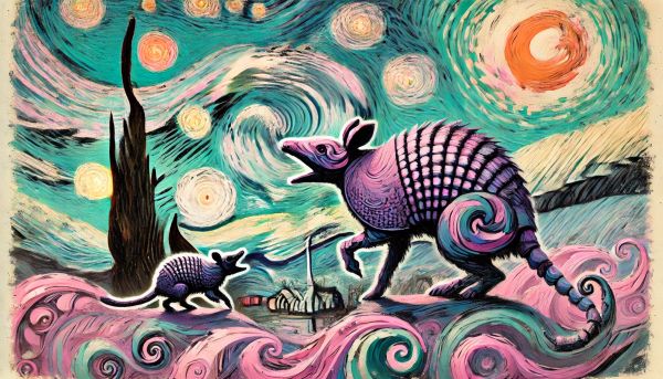 Title: Surreal Twilight: Mother and Baby Armadillo under Starry Texan Sky Photo ID: 60315