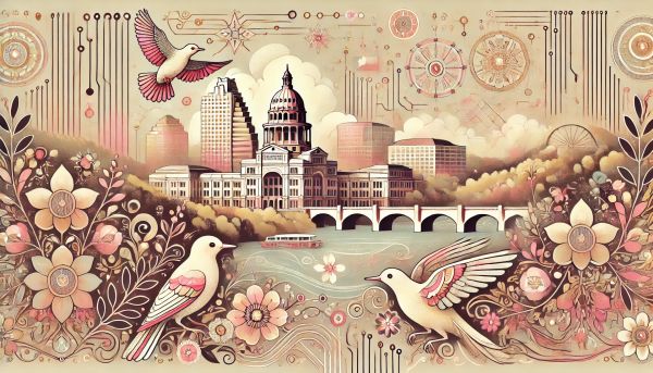 Immerse yourself in a captivating depiction of Austin, Texas, where classical beauty meets a modern cityscape. Swirling with soft pastels and bold contrasts, the image is a striking blend of the romanticism inherent in Rococo art and the contemporary elegance of Austin’s urban environment. At the heart, the Texas State Capitol stands majestic, framed by ethereal skies and bustling city life rendered in dreamy hues. Delicate floral motifs and whimsical birds animate the foreground, adding a touch of nature's serenity to the urban elegance. Majestic gears and celestial maps subtly incorporated in the background evoke a sense of timeless movement, reinforcing the city’s dynamic growth and innovative spirit. This art piece not only beautifies a space but also invokes a dialogue between historical richness and modern progress, making it a perfect addition to any collection. *** About Texas State Capitol: *** The Texas State Capitol, located in Downtown Austin, is an architectural marvel and a symbol of Texan power and politics. Established in 1888, it stands taller than the United States Capitol, and is noted for its significant design and construction, which embody late 19th century public architecture. It comprises the chambers of the Texas Legislature and the office of the governor. Declared a National Historic Landmark in 1986, its grounds are filled with monuments that tell stories of Texas’s complex history, from its early days as an independent republic to the modern state it is today.