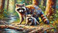 Mother and Cub Raccoon in Vibrant Autumn Woodland Scene