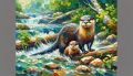 Playful Otters by the River: A Lively Palette Knife Artwork