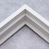 This stair step wood floater frame has a matte white finish with a steep upper and small lower step. The canvas will hover neatly within the simple, modern border.