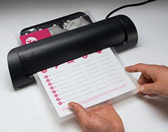 Laminators come in all shapes and sizes. The most commonly used laminator for home and office tends to be the pouch laminator. Pouch laminators are used to laminate smaller objects, usually ranging from small ID cards to large documents that may be poster-size. The “pouch” is made up of two laminating films that are attached on one side, making it easy to slide the document in and fit it between the laminating sheets. These pouches come in a variety of pre-cut sizes in order to cut down waste and trimming time. Due to the higher polyester-to-adhesive balance in laminating pouches, they also feel heavier and stiffer than laminating film. An example of a desktop office laminator.